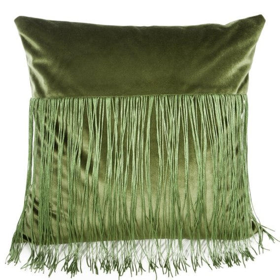 Welwetowa poszewka z ozdobnymi frędzlami.zapinana na suwak szerokość: 45 cm. długość: 45 cm. kolor: oliwkowy. Gramatura: 290 GSM. Skład: 100% poliester