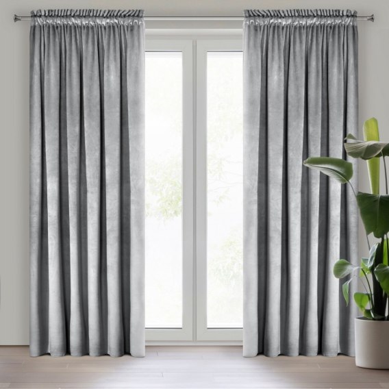 Zasłona welwetowa jednokolorowa szerokość: 140 cm. długość: 270 cm. kolor: szary. Gramatura: 200 GSM. Skład: 100% poliester