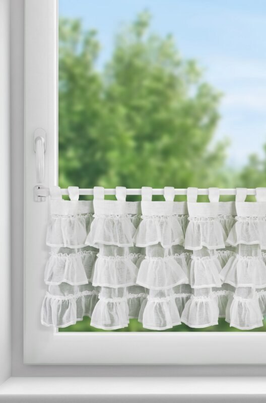 Zazdrostka gotowa zdobiona falbankami szerokość: 150 cm. długość: 45 cm. kolor: biały. Skład: 100% poliester