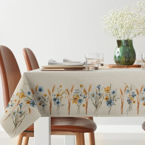 Obrus gobelinowy szerokość: 140 cm. długość: 180 cm. kolor: naturalny. Gramatura: 410 GSM. Skład: 63% poliester. 34% bawełna. 3% akryl