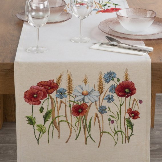 Obrus gobelinowy szerokość: 40 cm. długość: 100 cm. kolor: naturalny. Gramatura: 410 GSM. Skład: 63% poliester. 34% bawełna. 3% akryl