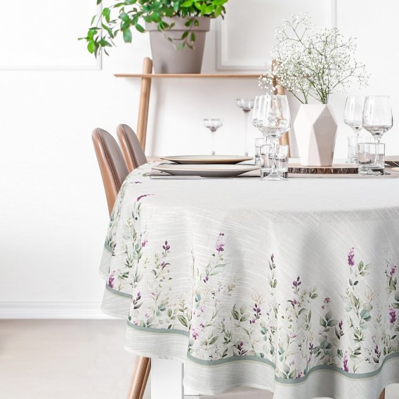Obrus z drukowanym wzorem w kwiaty kolor: naturalny. Gramatura: 275 GSM. Skład: 100% poliester