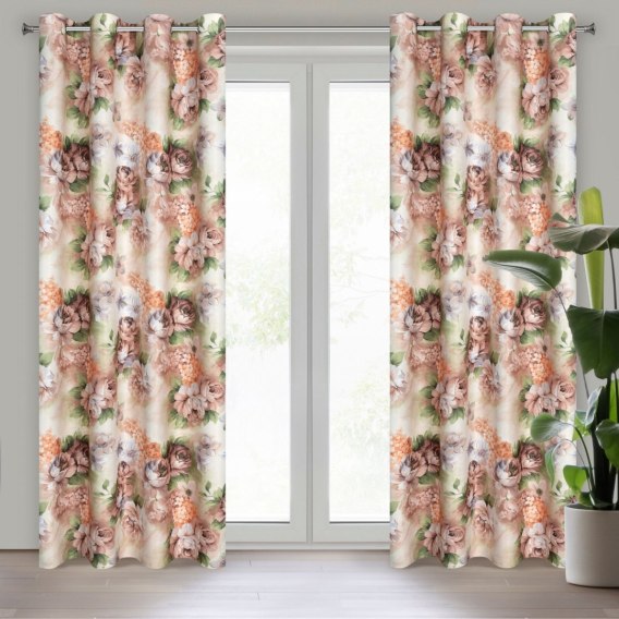 Zasłona gotowa zaciemniająca z nadrukiem szerokość: 140 cm. długość: 250 cm. kolor: beżowy. Gramatura: 210 GSM. Skład: 100% poliester