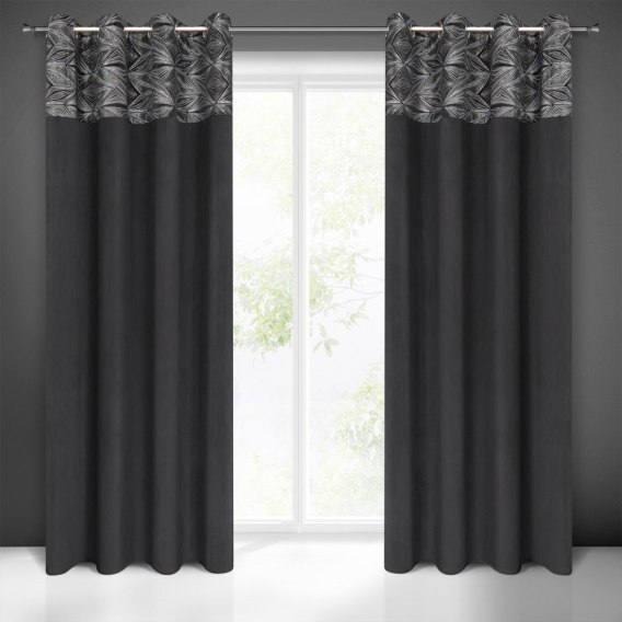 Zasłona welwetowa ze srebrnym nadrukiem szerokość: 140 cm. długość: 250 cm. kolor: czarny. Gramatura: 200 GSM. Skład: 100% poliester
