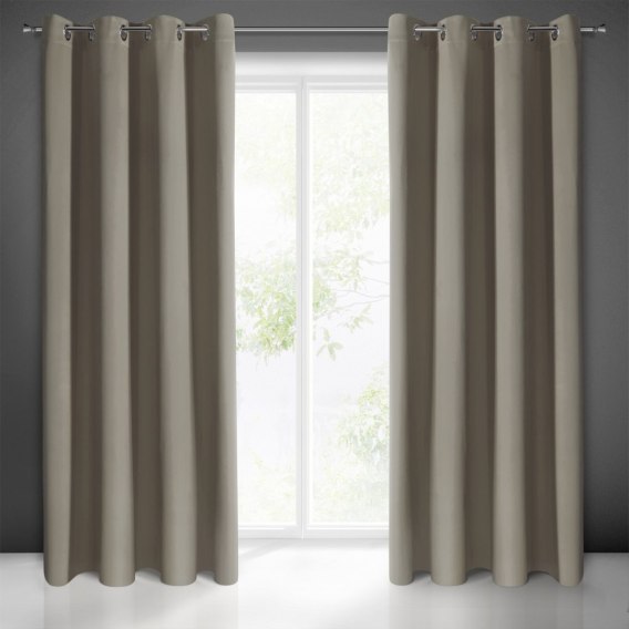 Zasłona gotowa zaciemniająca matowa szerokość: 135 cm. długość: 250 cm. kolor: szarobeżowy. Gramatura: 210 GSM. Skład: 100% poliester