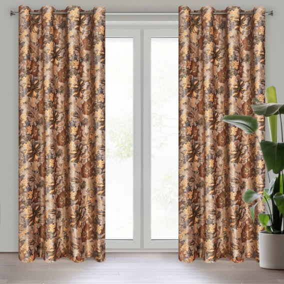 Zasłona welwetowa z nadrukiem kwiatowym szerokość: 140 cm. długość: 250 cm. kolor: rudy. Gramatura: 200 GSM. Skład: 100% poliester