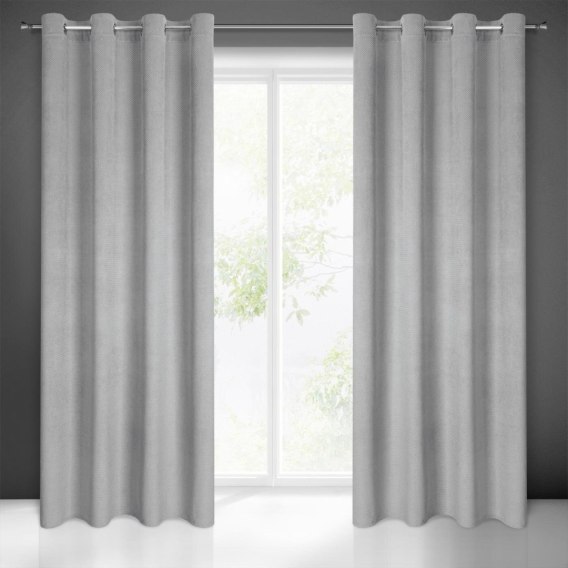 Lekka. welwetowa zasłona z miękkiej tkaniny o subtelnym połysku. charakterystycznym dla welwetów. Miękko się układa. Prasować na lewą stronę. szerokość: 140 cm. długość: 250 cm. kolor: srebrny. Gramatura: 210 GSM. Skład: 100% poliester