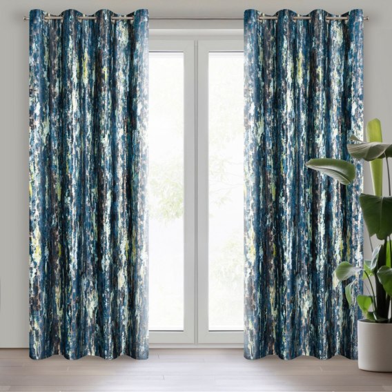 Zasłona welwetowa z metalicznym nadrukiem szerokość: 140 cm. długość: 250 cm. kolor: granatowy. Gramatura: 200 GSM. Skład: 100% poliester