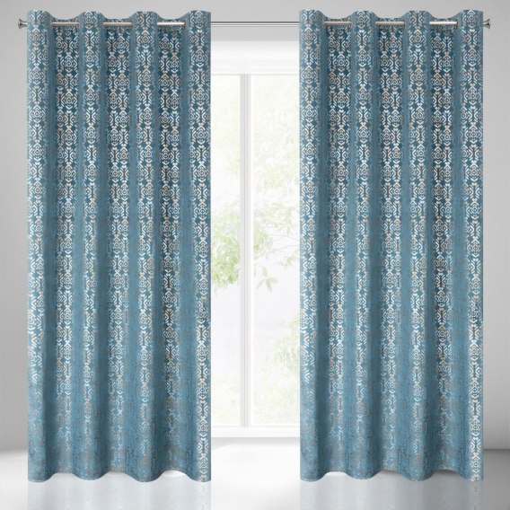 Zasłona welwetowa ze złotym i srebrnym nadrukiem szerokość: 140 cm. długość: 250 cm. kolor: niebieski. Gramatura: 200 GSM. Skład: 100% poliester