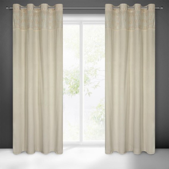 Zasłona welwetowa ze złotym i srebrnym nadrukiem szerokość: 140 cm. długość: 250 cm. kolor: kremowy. Gramatura: 200 GSM. Skład: 100% poliester
