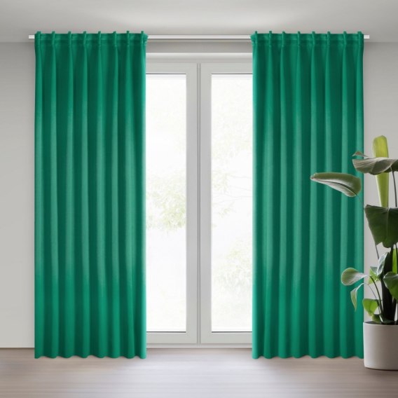 Zasłona zaciemniająca jednokolorowa z taśmą do szyn sufitowych szerokość: 140 cm. długość: 300 cm. kolor: ciemnozielony. Gramatura: 210 GSM. Skład: 100% poliester