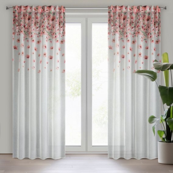 Zasłona z etaminy z nadrukiem szerokość: 140 cm. długość: 270 cm. kolor: biały. Gramatura: 75 GSM. Skład: 100% poliester