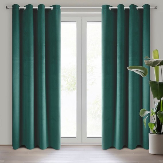 Miękka zasłona gotowa z jednokolorowego aksamitu o charakterystycznym dla welwetu połysku. Mięsista tkanina daje wysoki stopień zaciemnienia wnętrza. szerokość: 140 cm. długość: 250 cm. kolor: ciemnoturkusowy. Gramatura: 215 GSM. Skład: 100% poliester