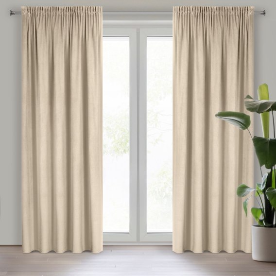 Miękka zasłona gotowa z jednokolorowego aksamitu o charakterystycznym dla welwetu połysku. Mięsista tkanina daje wysoki stopień zaciemnienia wnętrza. szerokość: 140 cm. długość: 300 cm. kolor: kremowy. Gramatura: 215 GSM. Skład: 100% poliester