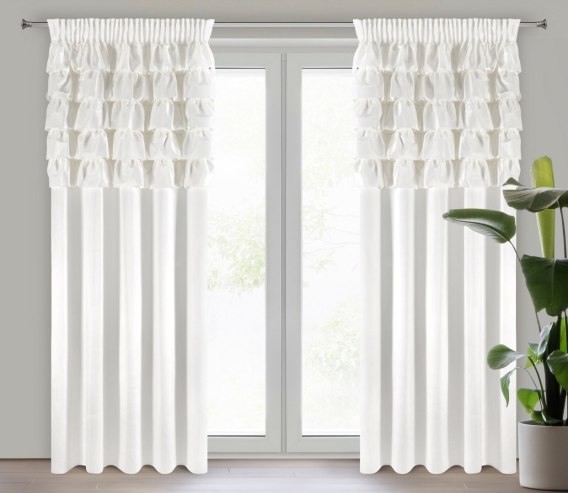 Zasłona gotowa welwetowa z falbanami od góry szerokość: 140 cm. długość: 250 cm. kolor: weiß. Gramatura: 200 GSM. Skład: 100% poliester