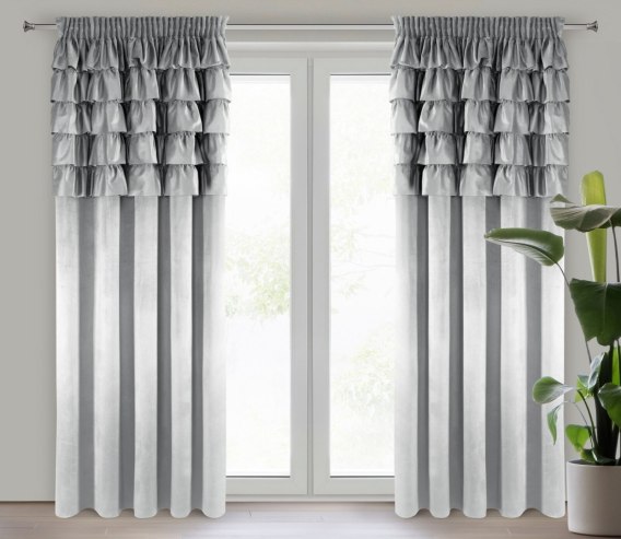 Zasłona gotowa welwetowa z falbanami od góry szerokość: 140 cm. długość: 270 cm. kolor: srebrny. Gramatura: 200 GSM. Skład: 100% poliester