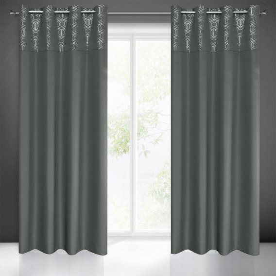 Zasłona gotowa ze srebrnym nadrukiem szerokość: 140 cm. długość: 250 cm. kolor: grafitowy. Gramatura: 140 GSM. Skład: 100% poliester