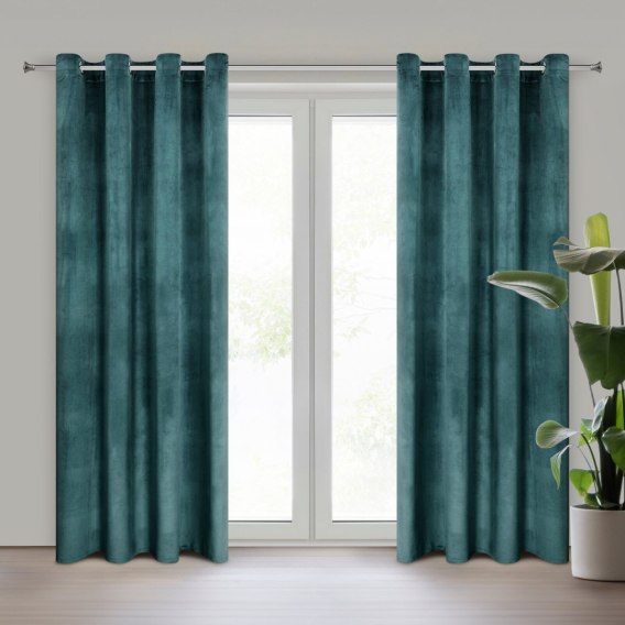 Miękka zasłona z welwetu o matowym wykończeniu. Mięsista tkanina o średnich właściwościach zaciemniających nadaje wnętrzu eleganckiego charakteru. szerokość: 140 cm. długość: 250 cm. kolor: ciemnoturkusowy. Gramatura: 200 GSM. Skład: 100% poliester