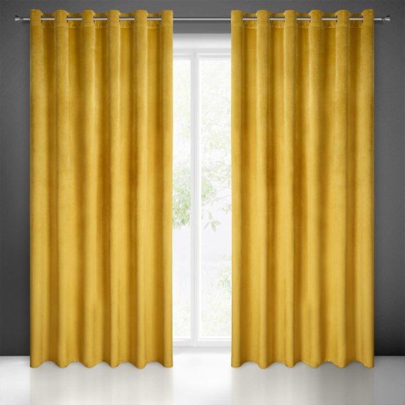 Miękka zasłona z welwetu o matowym wykończeniu. Mięsista tkanina o średnich właściwościach zaciemniających nadaje wnętrzu eleganckiego charakteru. szerokość: 215 cm. długość: 250 cm. kolor: musztardowy. Gramatura: 200 GSM. Skład: 100% poliester